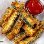 Crispy and flavorful baked zucchini fries coated with Parmesan cheese and panko breadcrumbs, seasoned with Italian herbs and spices. A healthy, delicious snack or side dish perfect for serving warm with your favorite dipping sauce.