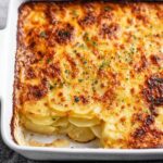 Classic Au Gratin Potatoes featuring thinly sliced Yukon Gold potatoes baked in a rich, creamy cheese sauce with layers of cheddar, gruyere, and Parmesan cheeses. This decadent side dish is perfect for holiday dinners or special occasions, offering a comforting blend of tender potatoes and melted cheese baked to golden perfection.