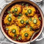 - Top the Chili: Drop the cornbread batter in 6-8 mounds evenly over the chili in the skillet. If desired, place a sliced jalapeno on each mound.