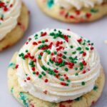 These Christmas Cake Batter Cookies are a festive and delicious treat perfect for the holiday season. Soft and buttery cookies flavored with cake batter extract and colorful holiday sprinkles are topped with a creamy, fluffy frosting that mirrors the beloved Crumbl cookie style. Easy to make and sure to impress at any holiday gathering.