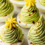 Christmas Tree Deviled Eggs are a festive and flavorful holiday appetizer featuring creamy avocado-mayo filling piped into hard-boiled egg whites shaped like mini Christmas trees, garnished with colorful bell pepper stars and red pepper flakes for a charming touch perfect for parties and gatherings.