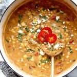 Buffalo Chicken Chili is a rich, creamy, and hearty dish featuring shredded chicken, sweet corn, smoky fire-roasted tomatoes, and creamy white beans all combined in a luxuriously smooth broth spiked with buffalo wing sauce and cream cheese. Perfectly balanced with layers of flavor, it’s an easy-to-make comfort meal ideal for any occasion, topped with blue cheese, tortilla chips, avocado, sour cream, or cilantro.