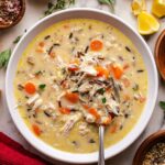 A cozy, creamy one-pot Chicken and Wild Rice Soup loaded with carrots, celery, onions, fresh herbs, and tender shredded chicken. Thickened just enough for a silky spoonful and brightened with a squeeze of lemon, this soup is a cold-weather comfort food classic perfect for weeknight dinners, make-ahead lunches, or easy entertaining.