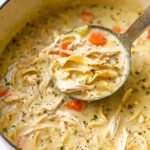- For a slow cooker version, after sautéing vegetables and combining with broth and potatoes, cook on low for 4-6 hours, then add chicken, milk, and noodles in the last 30 minutes.