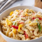 A creamy and flavorful Chicken Risotto with vegetables, perfect for a comforting family dinner. This recipe combines tender chicken breast, red bell peppers, and arborio rice cooked slowly in chicken stock and finished with Parmesan cheese for a rich, satisfying meal ready in 30 minutes.