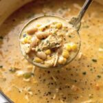 This creamy white chicken chili features tender shredded chicken, hearty white beans, sweet corn, and a blend of flavorful spices. Made with cream cheese for a luscious texture and garnished with fresh cilantro, sour cream, cheese, and tortilla strips, this comforting dish is perfect for a satisfying meal.