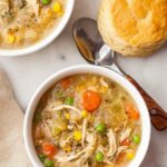 - Serve: Spoon the chicken and vegetable filling into bowls or plates and top each serving with a baked biscuit. Enjoy your comforting crock pot chicken pot pie!