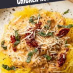 - Serve: Serve the chicken topped with sauce. Garnish with fresh basil and extra Parmesan cheese if desired. Accompany with hot cooked angel hair pasta or shredded spaghetti squash.