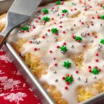 - Cool and Glaze Cake: Let the cake cool in the pan on a wire rack for about 15 minutes. Drizzle the glaze evenly over the warm cake. Add sprinkles on top if desired for a festive look.