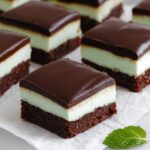 - Assemble the Brownies: Once the brownies are completely cooled, spread the mint buttercream evenly over the top. Then drizzle or spread the chocolate ganache over the buttercream. Let the brownies set at room temperature or chill briefly in the refrigerator until the ganache is firm.