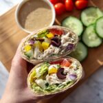A delicious and zesty Greek Turkey Wrap with creamy hummus, fresh veggies, feta cheese, and a drizzle of Greek vinaigrette, perfect for a quick and satisfying lunch.