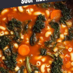Hearty and comforting Minestrone Soup loaded with tender pasta, creamy cannellini beans, kale, carrots, green beans, and simmered in a rich tomato and vegetable broth. This vegetarian soup is perfect for a cozy dinner and garnished with fresh basil and shaved parmesan.