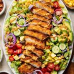 - Assemble Salad: Lay chopped romaine lettuce on a large serving platter. Evenly distribute cucumber slices, cherry tomatoes, crumbled bacon, diced avocado, corn, and thinly sliced red onion over the lettuce. Slice the cooked chicken cutlets and arrange on top, maintaining their breast shape if preferred.