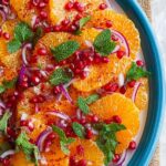 A refreshing and vibrant Mediterranean orange salad featuring sweet Navel oranges, crunchy pomegranate seeds, fresh mint, and a tangy honey-lime dressing, lightly spiced with paprika and cinnamon. Perfect as a light side or festive addition to any meal.