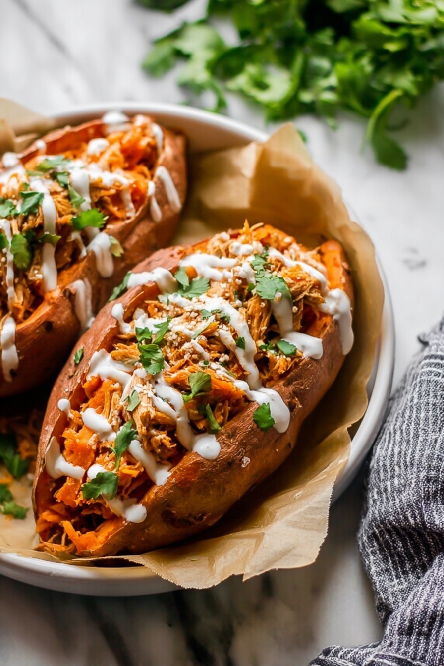 Slice open your sweet potatoes, pile on the buffalo chicken, and drizzle with ranch for that creamy counterpoint to the spice. It’s simple, satisfying, and always a crowd-pleaser in my house.