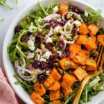- Assemble Salad: In a large bowl, combine the roasted sweet potatoes, baby arugula, thinly sliced shallots, dried cranberries or cherries, pepitas, and optional feta or goat cheese crumbles. Drizzle with 6 tablespoons of the dressing and toss gently to combine.