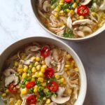 A comforting and flavorful Thai Style Chicken Noodle Soup that is gluten free and dairy free, featuring tender shredded chicken, fresh vegetables, and aromatic ingredients for a satisfying meal.